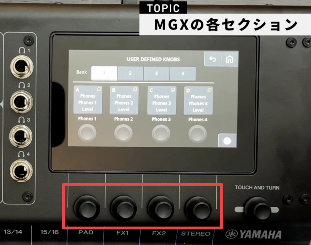 4つのノブはUSER DEFINED KNOBSとして、任意の機能を割り当て可能。バンク切り替えにも対応しており、ヘッドホンレベルや特定のパラメータを素早く操作できます。