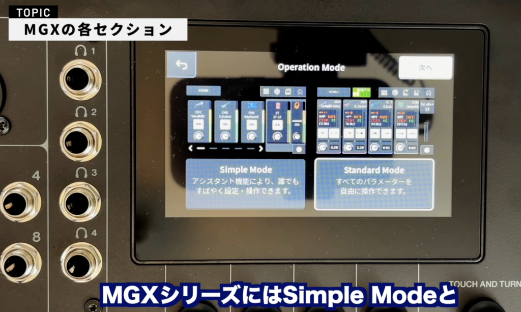 操作モードはSimple ModeとStandard Modeの2種類。Simple Modeでは、画面のガイドに沿って設定を進めることができ、ミキサーに不慣れな方でも安心してセットアップできます。
